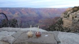 Nous allons regarder si le marchand de glace est ouvert. Même si la température ne s’y prête pas vraiment, nous aimerions faire un petit clin d’œil à Melissa (notre nièce côté italien) et surtout nous régaler encore de cette Dreyer’s Peanut Butter Cup. Le glacier est ouvert mais le choix de parfums est réduit. Tant pis. J’opte pour du chocolat et Stefano pour un mélange dont nous avons oublié le nom. Quelque soit le parfum, déguster une glace face au Grand Canyon, c’est tout simplement délicieux.