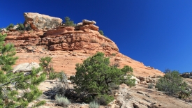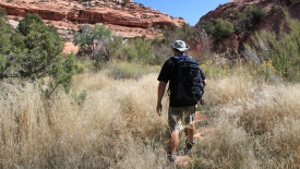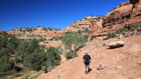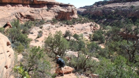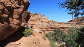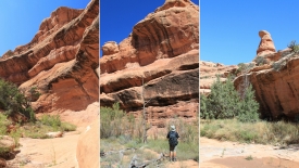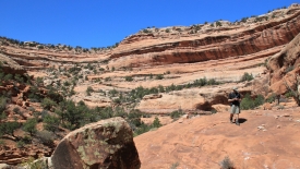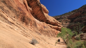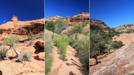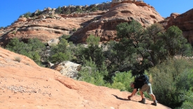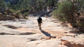 La remontée vers le rim se fait via le lit d’un wash, qui descend assez sec dans le canyon. La pente est raide, certes, mais le slickrock rend la marche facile. Dans du sable, l’histoire aurait été bien différente.