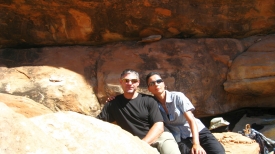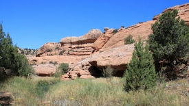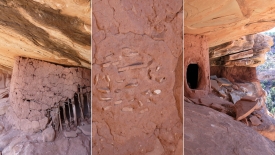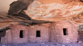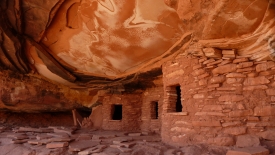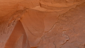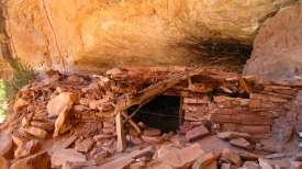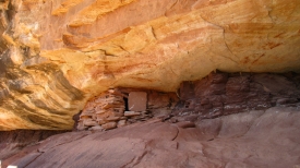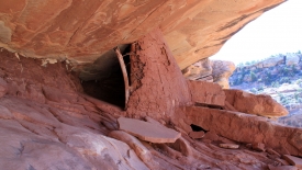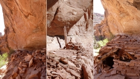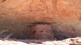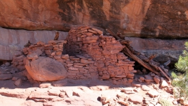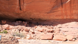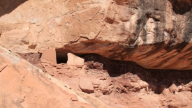 À nouveau niché sous un dévers de falaise, d’autres ruines, en assez mauvais état. Cependant, la forme de la construction nous fait dire qu’il s’agit certainement d’un kiva. Les principaux indices sont là : construction circulaire et toit de branches.