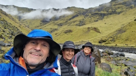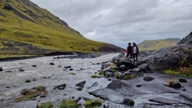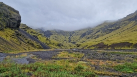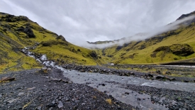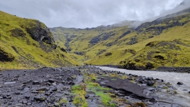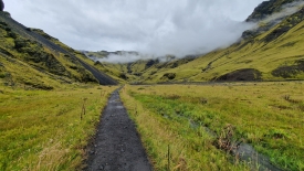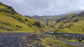 Alors que ce soir nous dormons à Hof, au pied du Vatnajökull, plus à l’est que Vik, nous repartons vers l’ouest en direction de Reykjavík et donc forcément nous repassons non loin de Skógafoss. Quelques kilomètres plus loin, une route, la route n° 242, part vers le nord. Après quelques centaines de mètres, elle se rétrécit jusqu’à ce qu’un bovi-stop signe l’arrêt du revêtement en goudron. Deux ou trois kilomètres plus loin, la route s’élargit à nouveau puis s’arrête. Le parking. Terminus, tout le monde descend. Stefano et Luana gardent leurs chaussures de randonnée et moi mes Keens. Quand je peux éviter d’avoir les pieds prisonniers de chaussettes et de chaussures, je ne me prive pas.