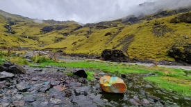 Le sentier se dirige vers le fond d’une vallée. Nous avons beau écarquiller les yeux, nous ne voyons rien qui ressemble de près ou de loin à une piscine. Que du vert, du vert à l’infini, entrecoupé de chutes d’eau et couronné de nuages.