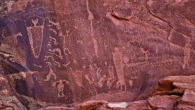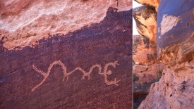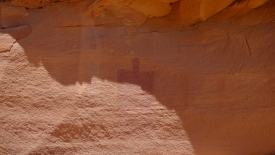Il ne nous reste plus qu’à rebrousser chemin. Mais Stefano a encore un tour dans son sac (sa liste de choses à voir est inépuisable). Nous allons traverser la route qui monte vers Canyonlands pour aller voir d’autres panneaux. Mais avant de traverser cette route, nous avons droit à encore un petit panneau de pétroglyphes.