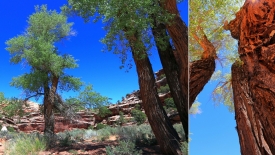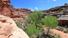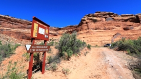 Nous venons de quitter Sego Canyon et partons vers Crescent Junction, puis empruntons la US-Highway-91 qui file directement à Moab. Là encore, les souvenirs resurgissent. Nous avons passé des moments extraordinaires ici, tant en randonnée pédestre qu’à VTT. Vivement nos prochaines longues vacances (pas encore planifiées, malheureusement) ou la retraite. Nous suivons ensuite la SR-313 qui monte à Island in the Sky, un des trois districts de Canyonlands. Nous nous arrêtons un peu avant d’avoir parcouru 4 km. Une barrière, un parking et un début de piste. Nous sommes à la South Fork de Sevenmile Canyon.