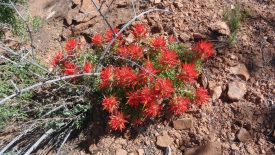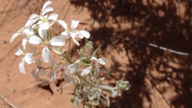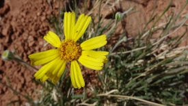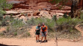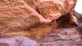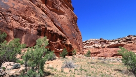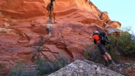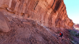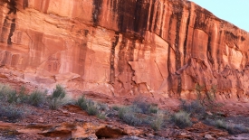 Nous suivons la piste qui nous fait traverser une zone de buissons assez dense. Nous débouchons ensuite dans le wash, délicieusement sablonneux (!). Avant d’entrer dans le canyon, Stefano nous dirige vers une falaise orientée nord-ouest. Il nous faut monter un peu, pour sortir du wash et arriver au pied de la falaise.