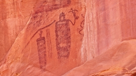 Le Kokopelli est un personnage mythique issu des croyances des Native Americans. Les sources divergent quant à ses fonctions : certaines y font référence comme un symbole de fertilité, de bonne fortune et de prospérité. Nous, nous nous rappelons avoir lu, au musée de Blanding, The Edge of the Cedars State Park, qu’il pouvait être voleur d’enfants voir même violeur. Une chose est sûre : ils sont toujours représentés courbés en avant, avec une flûte.