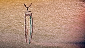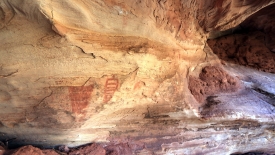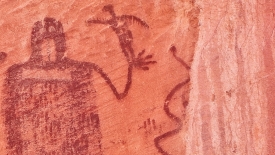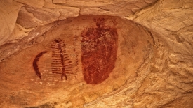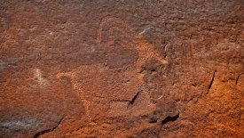 De gauche à droite, on distingue : une chèvre qui jaillit, des lignes de pointillés (peut-être une représentation de pluie), un chien (renard, loup) qui semble tout droit sortie d’un dessin animé, un serpent (ou de l’eau), des pieds, encore une chèvre au-dessus d’un kokopelli.