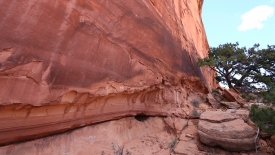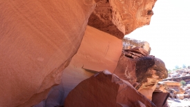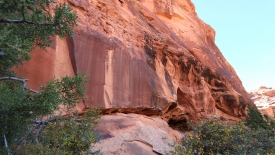 Kokopelli Panel dont voici un premier aperçu. Au centre de la photo, dans le prolongement de la coulée noire. Le panneau n’est pas accessible.