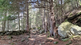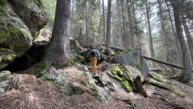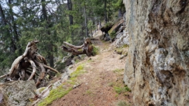 Le terrain est varié, agrémenté de quelques obstacles constitués de rochers à franchir et surtout d’arbres tombés. Des branches envahissent la sente, déjà jonchée de pommes de pin. Par endroit, le sol est recouvert d’écailles de ces cônes. Les pommes de pin, à moitié ou entièrement dévorées ne sont pas loin. Rares sont celles qui ont été « écaillées » sur toutes la longueur. Le plus souvent, seule la moitié, en partant de la base a été dénudée.