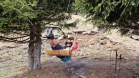 Juste au dessus de Predèlp, alors que le sentier coupe à travers champ, une balançoire a été installée entre deux sapins.