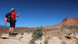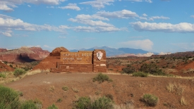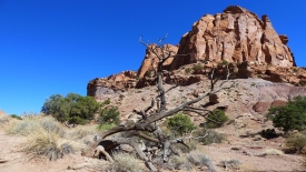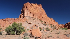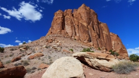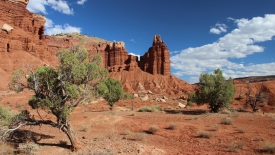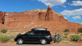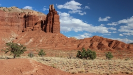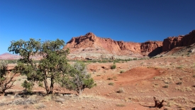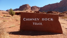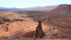 Tout comme en 2009, nous choisissons le chemin le plus long pour nous mener à l’entrée du canyon. Ce chemin a plusieurs avantage. D’abord, il monte, et il monte raide, ce qui a le mérite de nous échauffer. Ensuite, dans un moment, nous surplomberons Chimey Rock, une formation rocheuse emblématique de Capitol Reef.