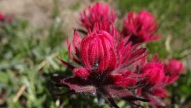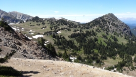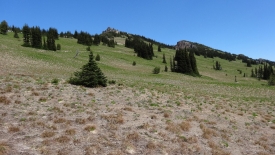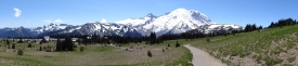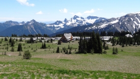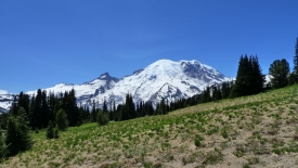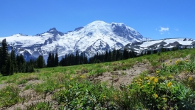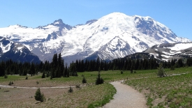 Un sentier monte dans la prairie, sur le flanc d’une colline, opposée au Mont Rainier, à gauche de la Ranger Station.