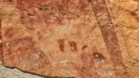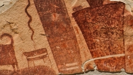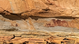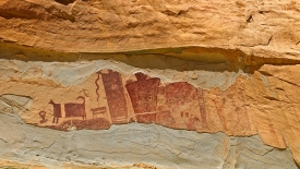 En lisant de la littérature quant à ce panneau (et de la littérature il y en a, comme, par exemple, cet extrait de Utah Rock Art, de Steven J. Manning), nous apprenons que, même si des disputes d’universitaires subsistent encore, la superposition de dessins place l’existence des artistes du Barrier Canyon Style avant ceux du Fremont Style. J’ai l’impression qu’à chaque fois que je relève des dates, elles diffèrent selon les sources. D’après Schaafsma (Schaafsma 1980:70), le Barrier Canyon Style a été créé par les peuples archaïques ayant existé entre 500 an avant J.-C. et 500 an après J.-C. Steven J. Manning, lui, est persuadé que ce style a perduré beaucoup plus longtemps. La culture Fremont, elle, aurait débuté environ en l’an 650 après J.-C. pour se terminer entre 1’200 et 1’250.
