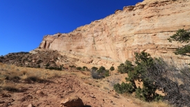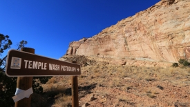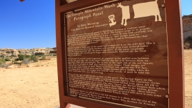 Arrivés sur la State route-24, nous repartons vers Green River jusqu’à trouver la route qui mène à Temple Mountain. Nous connaissons bien cette route pour y être passés en 2011 et 2012, à pied et en voiture. Mais nous n’avions jamais remarqué ce panneau. Il faut avouer qu’à l’époque, nous étions plus dans l’exploration des slot canyons que dans la recherche de pétroglyphes ou pictogrammes .