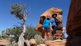 Nous venons de remonter sur le rim. Nous rencontrons un couple un peu plus âgé que nous. Ils cherchent leur chemin. Il est vrai que même avec les cairns, il est difficile d’imaginer que le sentier, jusqu’alors très tranquille, descende ainsi abruptement. Nous leur montrons le chemin que nous trouvons le plus facile à la descente (qui n’est d’ailleurs pas le même qu’à la montée) mais ils renoncent. Elle a des problèmes de hanche qu’elle ne veut pas trop solliciter. Dommage pour eux.