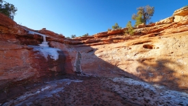 À l’endroit où nous avons rejoint le canyon, un pour-off et une cascade d’eau gelée. C’est la seule eau que nous ayons vu de tout notre séjour. Même gelée, elle attire beaucoup d’animaux, qui ont laissé leur empreintes sur le sol meuble.