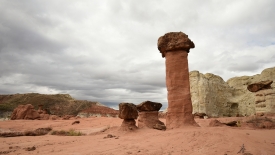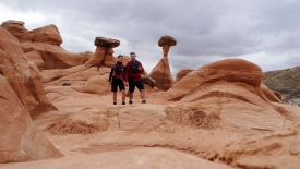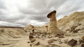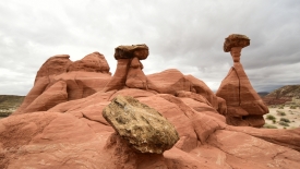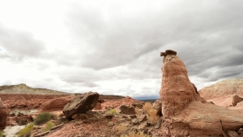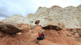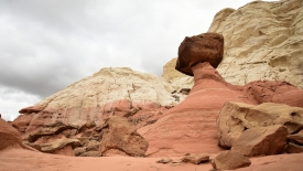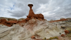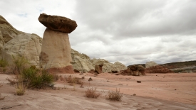 Nous arrêtons sur le parking du site des Toadstools Hoodoos, appelé aussi Paria Rimrocks. Comme il pleuviote un peu, nous commençons par une sieste, qui ne dure que quelques minutes car notre allemand et surtout son camping-car étrange nous réveillent.