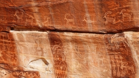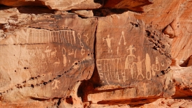Un nouveau dessin semble également récurrent sur les différents sites, y compris celui de Newspaper Rock : ce que j’ai d’abord appelé des cônes de glace. Les amateurs de pétroglyphes semblent s’accorder sur le fait qu’ils représentent des burdens baskets, soit des paniers conçus pour transporter de la nourriture. En observant attentivement, certains sont à l’endroit, comme celui représenté tout à droite sur la photo ci-dessus. D’autres sont à l’envers, la anse dirigée le sol, comme c’est le cas sur la même photo, mais au centre gauche.