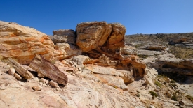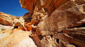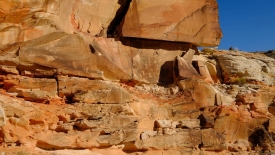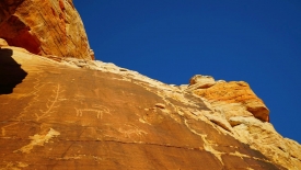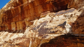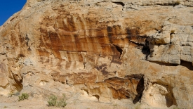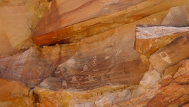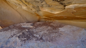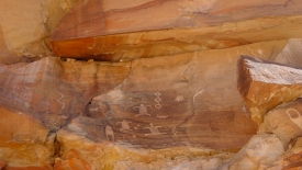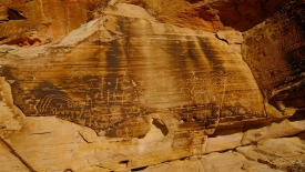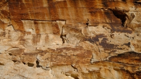 Pas très loin du Newpaper Rock (ou Picture Rock comme l’appelle certains), nous découvrons un panneau très ancien, malmené par le temps. Il a été dessiné sur un rocher presque horizontal, à l’abri d’une alcôve.