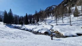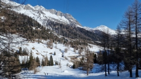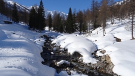 Nous rejoignons All’Acqua en longeant le bas-côté de la route, couvert de l’épaisse couche de neige accumulée par le passage du chasse neige. La surface est dure et le froid aidant, nous couvrons en quelques minutes les mille mètres qui nous séparent du départ du sentier.