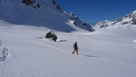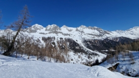 Sur la droite, derrière la crête, se trouve le passo San Giacomo et sa jolie petite chapelle. Nous avons hâte de pouvoir y retourner. D’après les traces de ski qui marquent la montagne, y accéder en raquette semble faisable. Même si quelques pentes sont estimées à plus de 30°.