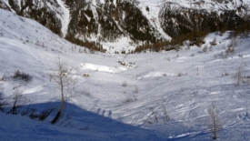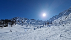 Notre première randonnée se fera dans le Val Cavagnolo. Vue du bas, la pente nous parait vertigineuse et nous ne sommes qu’admiration pour les audacieux qui s’y lancent. De janvier à février, elle est majoritairement à l’ombre mais avec l’allongement des jours, en arrivant ce matin vers 9h30, une bonne partie du val Cavalogno est déjà baignée de lumière.