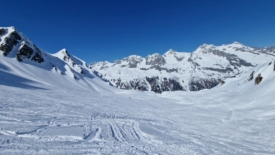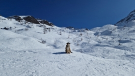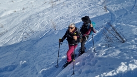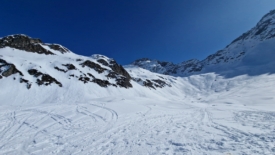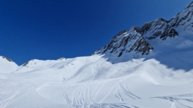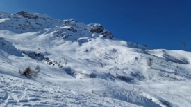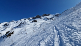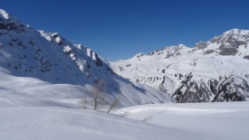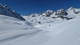 Le casse-croûte dégusté, nous nous préparons à la descente. Les critères de choix de l’itinéraire de descente ne sont pas forcément les mêmes que ceux de la montée. Nous choisissons de commencer le retour par un champ de neige vierge, trop peu pentu pour avoir attiré les skieurs, pour notre plus grand bonheur.
