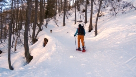 De retour à l’orée de la forêt, la neige durcie complique un peu la descente. Le moins mauvais choix est de prendre les bosses par le flanc, en un zigzag opportuniste. Les raquettes ne sont plus à l’horizontale et nous avons hâte d’arriver en bas.