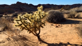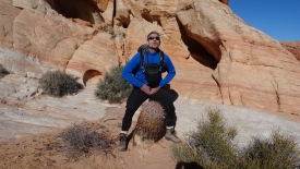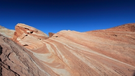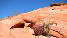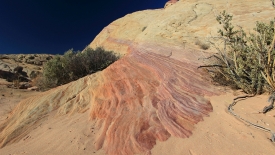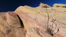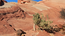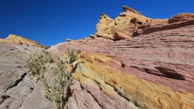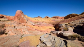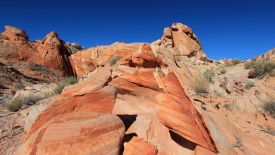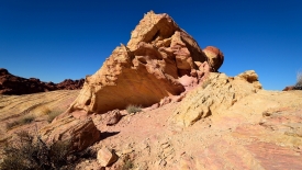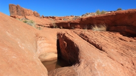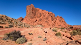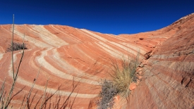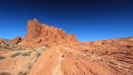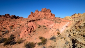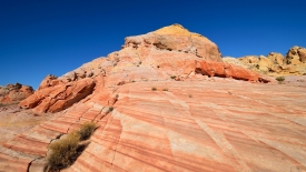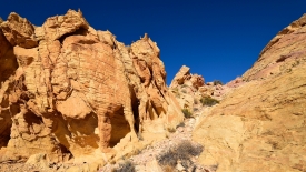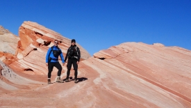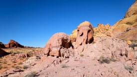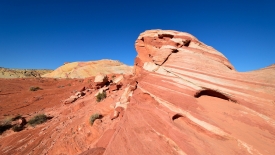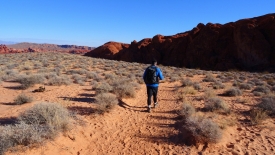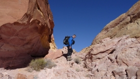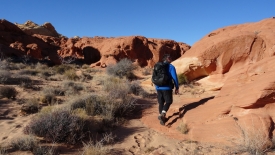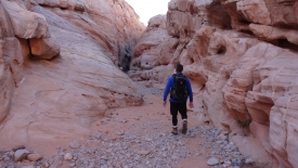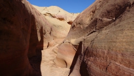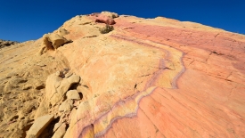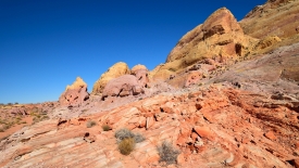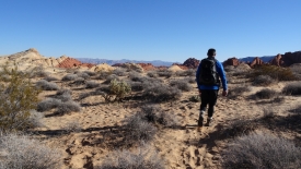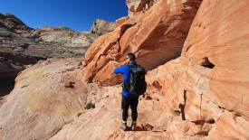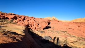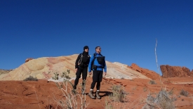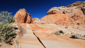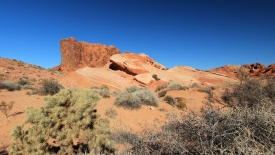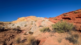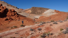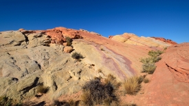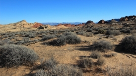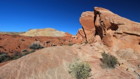 Quelques taches de neige sont éparpillées sur les versants à l’ombre. Nous allons directement en direction des Whites Domes et nous arrêtons un peu avant, au départ du sentier qui mène à Fire Wave .