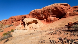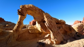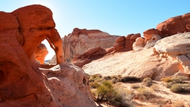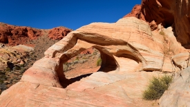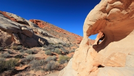 Nous suivons ce faint trail et arrivons en vue du parking, en contrebas, des White Domes. A notre hauteur, sur un monticule adjacent, nous repérons une petite arche.