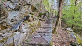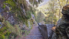 Le sentier continue. Un coup d’œil au GPS confirme qu’il rejoint le sentier principal. Après une belle portion large et plane, il s’élève dans le flanc de la montagne par lacets étroits successifs, parfois, à peine tracé. Nous entendons le fracas de l’eau qui dévale dans la gorge en contre-bas. Par deux fois nous consultons le GPS pour nous faire une idée du reste à faire. En levant les yeux, nous apercevons un mur de soutènement. Le sentier !