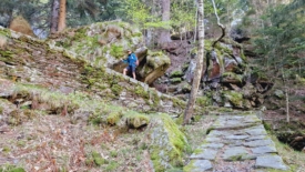 Le long du vieux chemin, des ruines d’habitation se dressent encore au milieu d’énormes blocs de rochers.