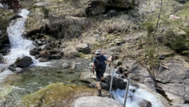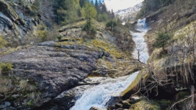 Devant nous, une cascade se fracasse sur les rochers. Le torrent traverse le sentier. Le gué est recouvert de neige. Il ne nous en faut pas plus pour nous dire qu’il est temps de faire demi-tour, même si le GPS nous montre que l’alpage est à bout touchant. Nous sommes déjà super contents d’avoir pu arriver jusque-là d’autant que le sentier, bien que large, est par endroit exposé. Nous rebroussons donc chemin.