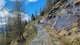 A notre grande surprise, au sortir de l’alpage, nous retrouvons le sentier pavé vraisemblablement construit à la même époque que la Straa di vacc. Ou peut-être est-ce son prolongement ? Nous marchons ainsi en suivant le sentier, avec comme idée de pousser jusqu’au prochain alpage. Nous contournons sans difficulté une première plaque de neige. La seconde n’est pas loin. Les suivantes s’enchainent sans trop perturber notre avancée. Nous sortons de la forêt. Une grande traversée se dessine.