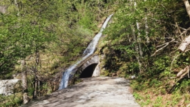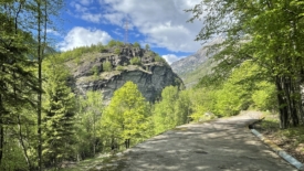 Un panneau annonce Cagiogno à 55 minutes. Très rapidement, nous nous retrouvons sur une route bétonnée qui n’est autre que le coffrage d’une conduite forcée. Par endroit, le sentier reprend ses droits.