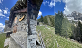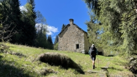 A l’approche de l’Alpe Aloro, et des 5 ou 6 étables dont certaines reconverties en maison d’habitation, nous sommes accueillis par une bonne odeur de viande grillée. MC décèle même une odeur de poivrons grillés. Nos papilles commencent à frétiller et nos glandes salivaires nous inondent la bouche. Oh, les amis… du calme. Il ne va rien se passer ! Nous croisons un homme en train de couper du bois, celui-là même qui, dans quelques minutes – il est quasiment midi – s’assiéra à table pour découper son morceau de viande juteux et tendre. Y’en a vraiment qui ont de la chance.