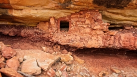 Nous n’étions pas certains de trouver quelque chose à l’endroit où nous avions interprété un relief sur la falaise comme une ruine. Mais plus nous avançons, plus l’évidence qu’une main d’homme soit passée par là se confirme. Il y a bien un mur et quelques greniers.
