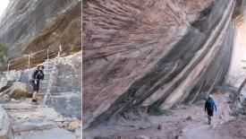 La descente se fait maintenant sur du slick rock et lorsque la pente est trop accentuée, des marches ont été creusées et des rampes ajoutées.