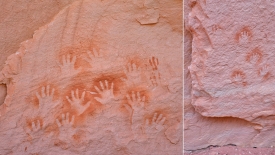 Je regarde vers le sol et vois une autre série (1) puis encore une autre (2) dont les empreintes de mains sont toutes petites. Des mains d’enfants ! Je les imagine les bras tendus, les mains collées à la roche, trépignant d’impatience, attendant que quelqu’un projette le colorant. Trop chou !