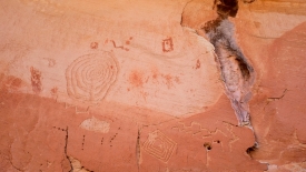 Au-dessus de l’emplacement d’une ancienne construction (la suie des feux est encore visible), quelques pictogrammes : des mains, un mouflon (en blanc) et une forme humaine.