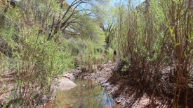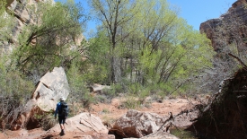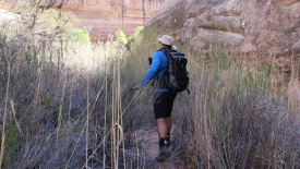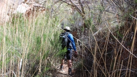 Les parois à pic ne nous permettent pas de prendre de la hauteur lorsque la végétation devient dense. Nous sommes donc contraints de nous frayer un passage au milieu des roseaux ou des buissons. Mais comme nous l’avait promis un ranger, pas de tamaris. Le super-intendant veille au grain et descend régulièrement exterminer de ses mains les tamaris imprudents qui auraient le toupet de venir pousser dans son parc.