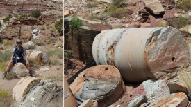 À savoir trouver un moyen de descendre, coûte que coûte, même si pour cela nous devons revenir à notre point de départ. Finalement, l’œil aiguisé de Stefano imagine un moyen de descendre, là où la montagne a naturellement été coupée et là où passe la Temple Mountain Road.