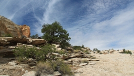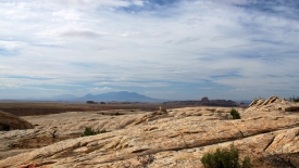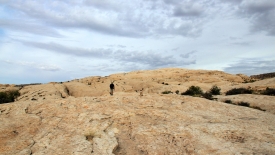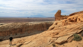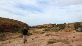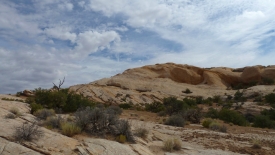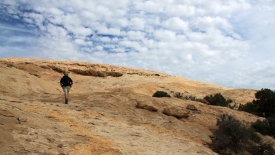 Le sentier est constitué de quelques cairns, éparpillés de ci de là. Pas de traces visibles, car nous marchons sur du slick rock, c’est à dire de la pierre à nu.