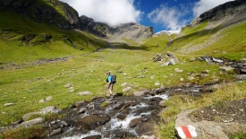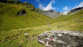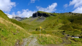Le sentier, tantôt herbeux, tantôt rocailleux, traverse plusieurs fois le ruisseau Geissbach. La pente est raide mais pas insurmontable. Stefano avance à grands pas lents et je n’ai pas trop de peine à suivre le rythme.