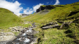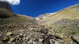 Nous allons remonter ce petit ruisseau jusqu’au fond de la vallée, là où on aperçoit la neige.