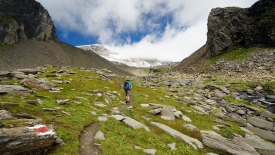 Je me force à lever de temps en temps la tête pour regarder autour de moi et profiter ainsi de la beauté des lieux. Sinon, mon champ de vision s’arrête à une paire de chaussures de montagne surmontée de mollets robustes. Joli spectacle, certes, mais…