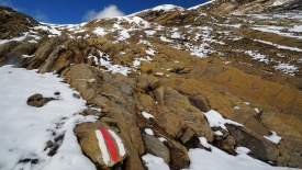 Le balisage jaune a fait place à celui rouge et blanc. Nous sommes sur un sentier de type « Chemin de Randonnée de montagne ». Finie la rigolade !