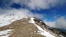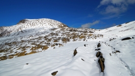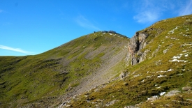 La pente s’accentue un peu pour nous mener à un premier cairn, symbolisant un « sommet ».