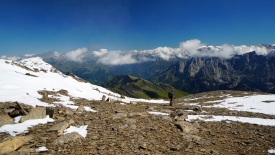 Le début de la descente est l’occasion d’admirer les crêtes enneigées alpines.