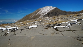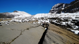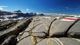 Du pierrier, nous passons à des pans de rochers inclinés, d’une jolie couleur brune. Certaines parties, plus grises, sont striées de blanc.