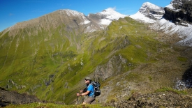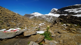 Mais non, je ne suis pas arrivée en haut avant Stefano, voyons ! Je lui ai demandé de redescendre de quelques mètres et lui, gentil comme tout, s’est exécuté. Tout au fond, le col par lequel nous sommes passés. A droite, le Schwarzhoren (2’928), à gauche le Wildgärst (2’890) et toujours à gauche, dans sa continuité, le Gärstenhoren (2’797). Sur ces flancs, nous apercevons des chèvres. Ce sont leurs clochettes qui nous ont permis de les repérer.